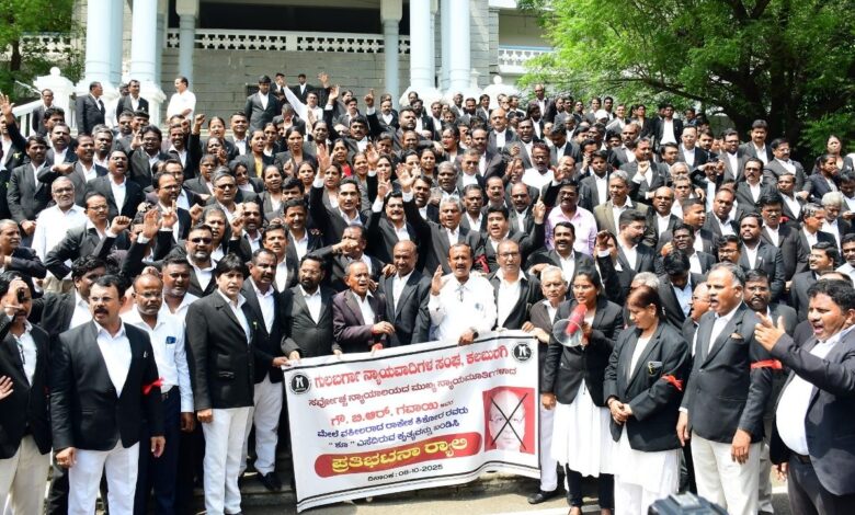 ಕಲಬುರಗಿ: ಸುಪ್ರೀಂಕೋರ್ಟ್ ಮುಖ್ಯ ನ್ಯಾಯಮೂರ್ತಿ ಬಿ.ಆರ್.ಗವಾಯಿ ಅವರತ್ತ ಶೂ ಎಸೆಯಲು ಯತ್ನಿಸಿದ ಘಟನೆಗೆ ಖಂಡನೆ ವ್ಯಕ್ತಪಡಿಸಿ, ಕಲಬುರಗಿಯ ವಕೀಲರು ಬುಧವಾರ ಕೋರ್ಟ್ ಕಾರ್ಯಗಳನ್ನು ಬಹಿಷ್ಕರಿಸಿ ಬೀದಿಗಿಳಿದು ಆಕ್ರೋಶ ವ್ಯಕ್ತಪಡಿಸಿದರು.